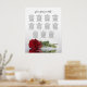 This elegant wedding seating chart has table assignments for 110 guests at 11 tables (10 people per table.) The design is beautiful, sophisticated, romantic and stylish. It features a single red rose reflecting in water with waves and ripples. The title reads "please find your table" in lacy script calligraphy. There is space for the names of the couple and wedding date.