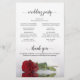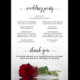 These wedding programs are elegant and tasteful, while still being budget friendly. The design features a single long stemmed red rose lying on its side, reflecting in a pool of water with waves and ripples. The typography features lacy black script calligraphy, and there is room for details on the ceremony, the bridal party, and a short thank you.