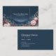 Define your brand with the intense romance and mystery of a nocturnal landscape using this captivating business card. The design is dominated by a deep, midnight blue starry sky that fades into a misty mountain range, creating a tranquil, dark twilight atmosphere over a small body of water. The foreground is richly framed by an abundant border of vintage-style roses in a dramatic palette—featuring deep burgundy, crimson, and soft blush blooms, accented by silvery blue and dark green foliage. A clean metallic gold rectangular frame sits centrally, elegantly highlighting the serene landscape and providing a sophisticated space for your key information. This artwork blends the quiet depth of a romantic landscape with intricate, vibrant botanical detail, resulting in a powerful and truly unique brand statement. This business card is ideally suited for a luxury event stylist specializing in romantic or deep-toned themed occasions, a boutique hotelier wanting to convey a picturesque, tranquil setting, or a vintage fashion curator whose collection is inspired by dark, rich romance. It would also perfectly suit a fantasy novelist or editor seeking distinctive, narrative-driven branding, or a fine art print seller specializing in atmospheric landscapes.
