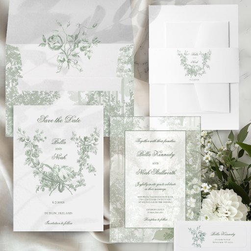 This classic design captures all the elegance and romance of 18th century France, and features an etched sage green floral wreath encircling a pair of nesting lovebirds. Customize the opacity level of the graphics in the design editor, if desired.