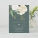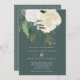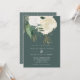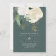 A modern and romantic wedding invitation, perfect for an autumn or winter wedding. This design features a cascade of watercolor roses in white and ivory, green leaves and a dusting of faux glitter, on a dark sage green background. The reverse is also in solid dark green.