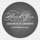 Romantic Script Thank You Wedding Favour Labels. Elke Clarke © Available at www.zazzle.com/epclarke. White script font on a black chalkboard background(printed photo effect). Customise with your bride and groom names and wedding date. A simple, classic, traditional, versatile design for an elegant wedding or romantic wedding.