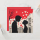 A visually striking artwork depicting a romantic scene featuring a silhouetted couple gazing at each other. The background showcases a vibrant red sky filled with floating white and red hearts, alongside stark black-and-white buildings and a bare tree, suggesting a city setting. The art style is bold, modern, and minimalistic, emphasizing love and connection between the two figures.