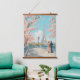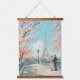 A beautifully illustrated 1950s-style travel poster depicting a romantic couple strolling beneath blooming cherry blossoms with the Eiffel Tower in the background. The pastel tones and retro aesthetic capture the timeless charm of springtime in Paris.