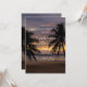A breathtaking beach sunset scene featuring a golden and purple sky, calm ocean waves, and a black silhouette of a palm tree on the right. The warm hues reflect on the water, creating a romantic and serene atmosphere—perfect for a wedding invitation.