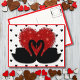 Elegant and romantic Valentine's Day postcard featuring two graceful black swans forming a heart shape against a sparkling red heart backdrop. The design is framed by a bold red border, adding a polished finish and enhancing the overall visual appeal. Tiny black hearts scatter across the white background, creating a charming and timeless look. The back of the postcard mirrors the elegance of the front with a matching red border, a smaller swan heart graphic at the bottom, and delicate arrow details framing the stamp area. Perfect for sharing love and affection this Valentine’s Day.