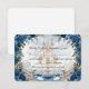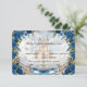 Transport your guests to a happily ever after. This enchanted design features a romantic castle illustration, perfect for a royal-themed luxury wedding.This design features a highly detailed digital illustration simulating a watercolor painting effect. The scene depicts a grand stone staircase leading up to a majestic storybook castle, flanked by a water fountain and two elegant white swans. The artwork is framed by deep navy blue roses and sage green foliage against a soft beige and dreamy blue cloud background. Text is rendered in a mix of traditional serif fonts and sweeping calligraphy.This is a flat printed image with a watercolor visual effect; it does not contain actual paint texture or raised foiling.