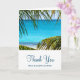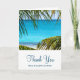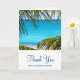 A folded wedding thank you card with a beautiful photograph of a turquoise tropical beach with large green palm fronds framing the scene. Personalised message inside card.