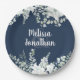 Romantic floral wedding paper plates, featuring a delicate watercolor bouquet with white gentle flowers, greenery, and other botanical foliage, over a classy dark blue background. Easily edit the template fields to add your names in a classy white font.