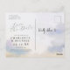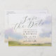 Romantic watercolor landscape save the date postcard, featuring dreamy watercolor clouds and a landscape scenery seen from far away.