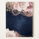 This wedding planner has a glamourous, vintage fairy tale theme. The background is a faded, dark navy moody blue with watercolor roses with glitter accents. Romantic blush coloured roses are pictured with ink patterns and glam faux gold glitter accents. String lights accent the flowers at the top.