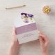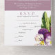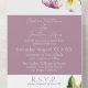 This romantic floral wedding invitation features an all-in-one design with an R.S.V.P. card included at the bottom. The background is a simple and elegant white on the top and bottom portions, with purple watercolor violets. The centre portion is a dusty lavender purple colour. A delicate bouquet of violet flowers is picture on the front flap, and two on the inside portion.