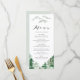 Woodland theme menu card featuring green watercolour trees and mountains. This whimsical menu card is perfect for forest and woodland theme events. Matching items are available.