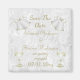 Personalized custom save the date for your engagement. Elegant, romantic white and gold wedding bells with champagne flutes engagement save the date for your special day. Beautiful and stylish white and gold wedding bells and cute, classy champagne glasses with bubbles, bows and wedding bands / rings images printed on a pretty floral, ornate white damask pattern background. Stunning, original, unique personalised save the dates for engagements, suitable for any season:- spring, summer, autumn / fall or winter. Artwork from J.Rett Graphics. http://www.jrett.