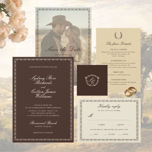 Step into the enchanting world of the Old West with our Romantic Western Ranch Wedding Invitation, where rustic charm seamlessly intertwines with refined sophistication. This exquisitely crafted invitation captures the spirit of a romantic western celebration, ideal for couples who admire the rugged beauty of the frontier combined with artistic elegance.