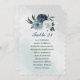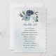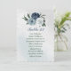 Beautiful botanical seating chart card featuring romantic white, dusty blue and navy blue flowers with green leaves.