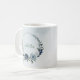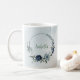 Beautiful botanical coffee mug featuring romantic white, dusty blue and navy blue flowers with green leaves.