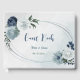 Beautiful botanical wedding guest book featuring romantic white, dusty blue and navy blue flowers with green leaves.