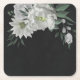 Unique wedding paper coaster featuring romantic white flowers and green leaves on black background