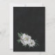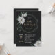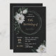 Unique birthday party invitation featuring romantic white flowers and green leaves on black background.