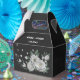 Unique wedding favour box featuring romantic white flowers and green leaves on black background.