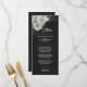Unique wedding menu card featuring romantic white flowers and green leaves on black background.