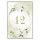Beautiful botanical table number card featuring romantic white flowers with some green leaves on gold geometric frame .The gold glitter details are simulated.