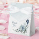 Beautiful botanical wedding favour box featuring romantic white, dusty blue and navy blue flowers with green leaves.