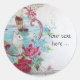 The sticker is made on wonderful paper and had no problem sticking to the bag that I purchased to put it on. I wanted to find a design that would be cute for the bride and groom and this one fit the bill as it has cute "bees" buzzing around and the wedding was taking place in a town called "Bee Cave". The packaging was great and protected the stickers. The website is easy to navigate and there are so many color choices. I had no problem finding a color that the bride was using on everything else selected. The design was adorable and there were many to choose from. You can make the figure as larger or smaller and you can place the photo and writting whereever you want to in the sticker. The printing is fabulous..better than expected.