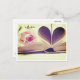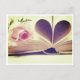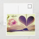 Eine Postkarte die die romantische Liebe zelebriert mit einer rosee Rose und den Seiten eines Buches in Herzform mit Gedichten oder einer Liebesgeschichte. Auf der Rückseite ist ein Zitat von Oscar Wilde übersetzt in deutscher Sprache.