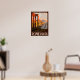 A vintage Rome travel poster shows the Roman Forum at dawn. It is an especially compelling and romantic idea. The sunlight hitting the buildings with pastel shades is shown in the background.