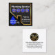 Cover features a gold rooftop building frame that is leaking blue water. Over at the top of the card lies the business name "Plumbing Service" alongside an array of plumbing icons/logos. This is followed by your prestigious name, job title with the phone contact and a slogan caption on the left. ; You can change the caption to the slogan to suit your own service needs.