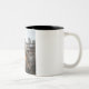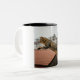Embark on a feline adventure with our two-tone ceramic mug featuring a daring cat leaping from rooftop to rooftop.