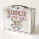 This vintage-style baseball-themed metal lunch box features the bold phrase "Rookie of the Year" with crossed bats, a glove, and a ball. Customisable with a name and year, this nostalgic design is perfect for little league players or any rookie baseball fan.