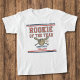 This vintage-style baseball-themed t-shirt features the bold phrase "Rookie of the Year" with crossed bats, a glove, and a ball. Customisable with a name and year, this nostalgic design is perfect for celebrating little league players, newborns, or any rookie baseball fan.