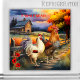 Kitchen magnet featuring a colourful fine art painting of a country farm scene with a rooster and chicken. A cheerful addition to any kitchen and a lovely gift for someone who likes to cook.