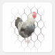 Situated on a rustic chicken wire background is this lovely black and white rooster.
