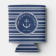 Preppy can coolers printed with a nautical monogram. Add your family name inside a rope circle, curved over a white anchor against a striped background in white and blue.