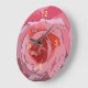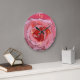 Pink, red and rose colored cartoon petals are the background for yellow clock numerals.