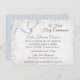 Blue Rosary and white lace, first Holy Communion Invitation with elegant custom text and blue stripes on reverse side of card.