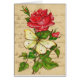 This design features lovely vintage artwork of a red rose spray, with a pretty pale yellow butterfly perched on it. The background is a tan colour with beautiful script.