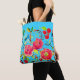 Cheerful rose and cherry floral pattern on your choice of lovely tote bag. A very fresh and summery design. Available in your choice of strap options. Customisable in your choice of background colour on both front and back (This item shown in vibrant sky blue). A bright and original floral addition to your day. Sweet.