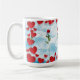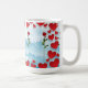 A dreamy valentine whimsical themed mug with red hearts as the border and the rose in the middle and then cascading roses around the mug with the clouds and sky in the backround creating a dreamy feel.