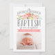 Stylish and chic baptism invitation featuring pink watercolor roses, a photo and invitation text on the back.