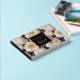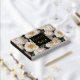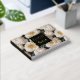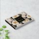 A simple yet eye-catching elegant seamless pattern featuring large ivory white rose flowers in full bloom with pale peach stamens set against a deep green leaf background that has a square black inlay edged with real gold foil. A text template for your custom wording reads "guest book" on the front and your personalised title will appear on the spine, which is black in colour too. Both text templates are real foil creating a timeless and luxury look to the cover.
