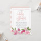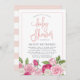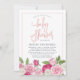 Elegant modern floral baby shower invitation features a bottom border of roses in white, blush and fuchsia pink with lush greenery peeking out. Personalise with your baby shower details in elegant blush and grey-blue typography accented with handwritten style calligraphy. Cards reverse to blush pink and white stripes.