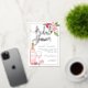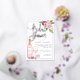 Elegant and modern bridal shower invitation for wine lovers features accents of roses in white, blush and fuchsia pink with lush greenery peeking out, a bottle and glass of rosé wine, and real rose gold foil printed accents. Personalise with your bridal shower details in elegant grey-blue typography accented with handwritten style calligraphy, and customise the wine bottle with the couple's initials. Cards reverse to blush pink and white stripes.