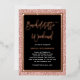 These glam, stylish bachelorette party invitations feature a faux rose gold glitter look (please note this is not actual glitter, but an image of glitter) and actual rose gold foil centre frame, with modern matching rose gold foil handwritten script. The very centre of the invitation is black. There is room to add your itinerary on the back.