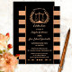 Elegant graduation party invitation featuring laurel leaves framing scales in stylised rose gold on a black background. On both sides are rose gold stripes on black.