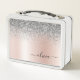 Rose Gold - Blush Pink and Silver Faux Foil Metallic Sparkle Glitter Brushed Metal Monogram Name Lunch Box. This makes the perfect sweet 16 birthday or going back to school gift for someone that loves glam luxury and chic styles.